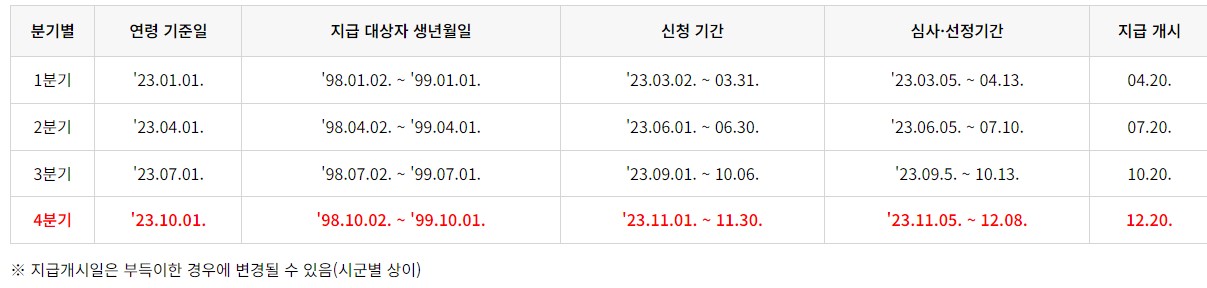 • 소급신청 2023년 10월 1일 기준 만 24세 청년에 한해서, 지난 분기 미신청분 추가신청 가능