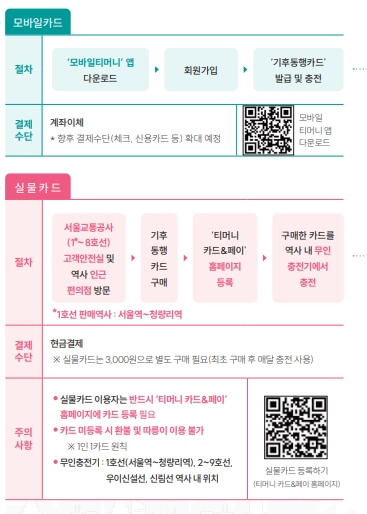 - 이용 범위: 서울지역 지하철, 서울시 면허 시내·마을버스, 따릉이