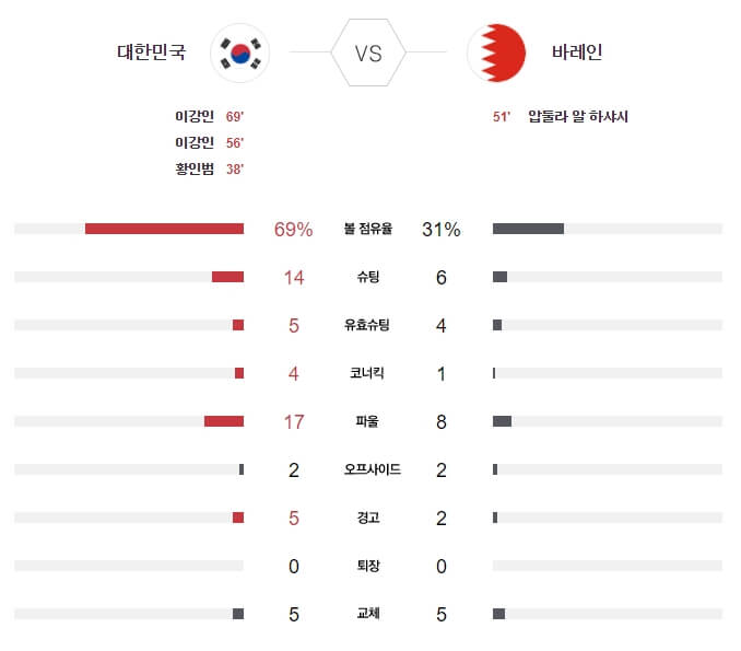 클린스만 감독이 이끄는 한국 축구대표팀은 15일(한국시간) 카타르 도하의 자심 빈 하마드 스타디움에서 열린 바레인과의 2023 아시안컵 조별리그 E조 1차전에서 3-1로 승리하며 승점 3점을 챙겼네요. 대한민국 아시안컵 첫 번째 골의 주인공은 황인범(즈베즈다), 멀티골로 쇄기를 박은 이강인(파리 생제르맹, A매치 20번째 경기에서 5, 6호 골)은 바레인전 최우수선수(Man of the match)로 선정되었네요.