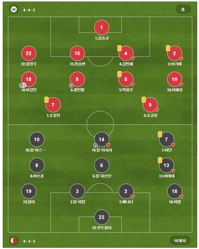 대한민국이 바레인을 3 : 1로 승리하며 64년만에 우승을 위해 한걸음 나간 것 같습니다. 하지만 중국 주심의 옐로 경고 카드 남발로(5장) 남은 경기를 잘 대비해서 준비를 해야 할 것 같네요.