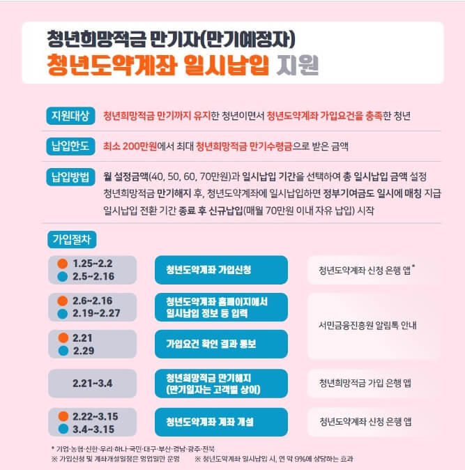 청년희망적금은 청년층(19세~34세)의 저축장려 및 안정적인 자산관리 형성을 위해 지원하는 정책으로 2024년 2월 만기이신 분은 2024년 3월까지, 2024년 3월 만기이신 분은 2024년 4월까지 청년도약계좌 가입신청하실 수 있습니다.